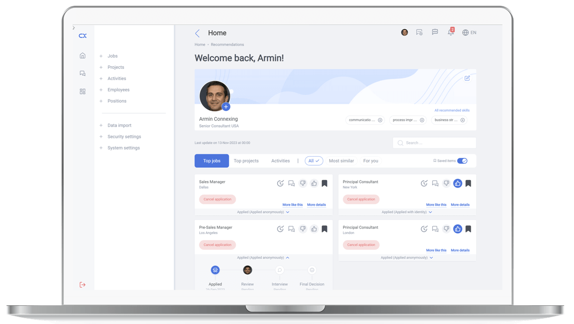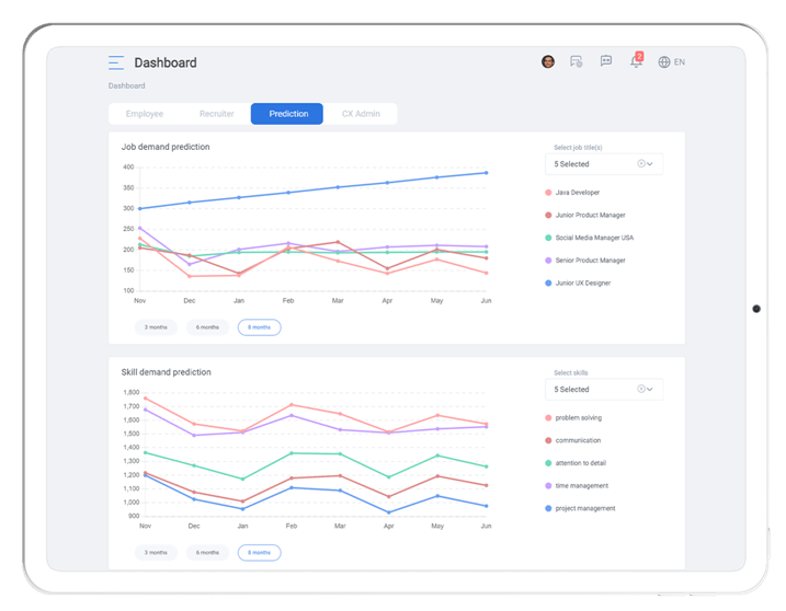ConneXing.io AI-based Internal Talent Marketplace seamlessly connects your employees with suitable opportunities – jobs, projects, and other activities – while recommending talents to hiring managers and your recruiting teams.